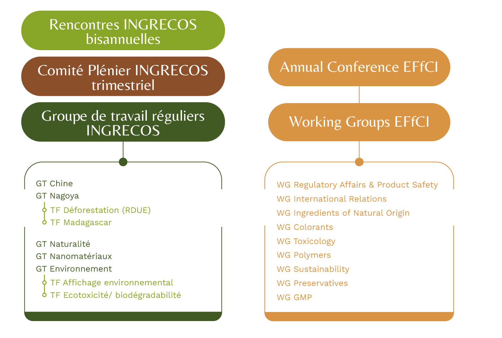 - Adhésion à l’EFfCI : En devenant membre d’INGRECOS, vous adhérez automatiquement à l’EFfCI, la fédération européenne des ingrédients cosmétiques, et pouvez participer à ses Working Groups et sa Conférence Annuelle.