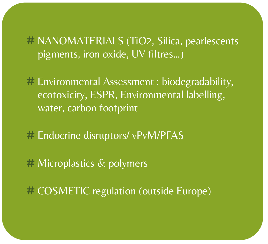 - Regular Working Groups : Participate in INGRECOS expert-led thematic working groups focused on major issues concerning cosmetic ingredients.